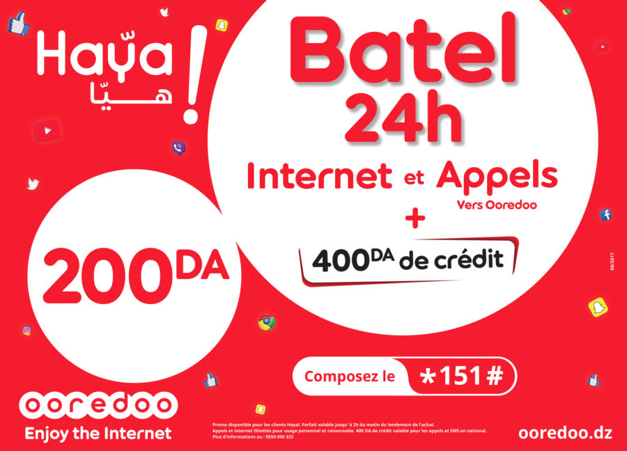 Avec le forfait Haya ! 200, Ooredoo offre l’opportunité à ses clients souscripteurs à l’offre Haya ! de profiter de l’internet et d’appels Batel (gratuits) en illimité, en plus d’un bonus de 400 DA de crédit d’appels.